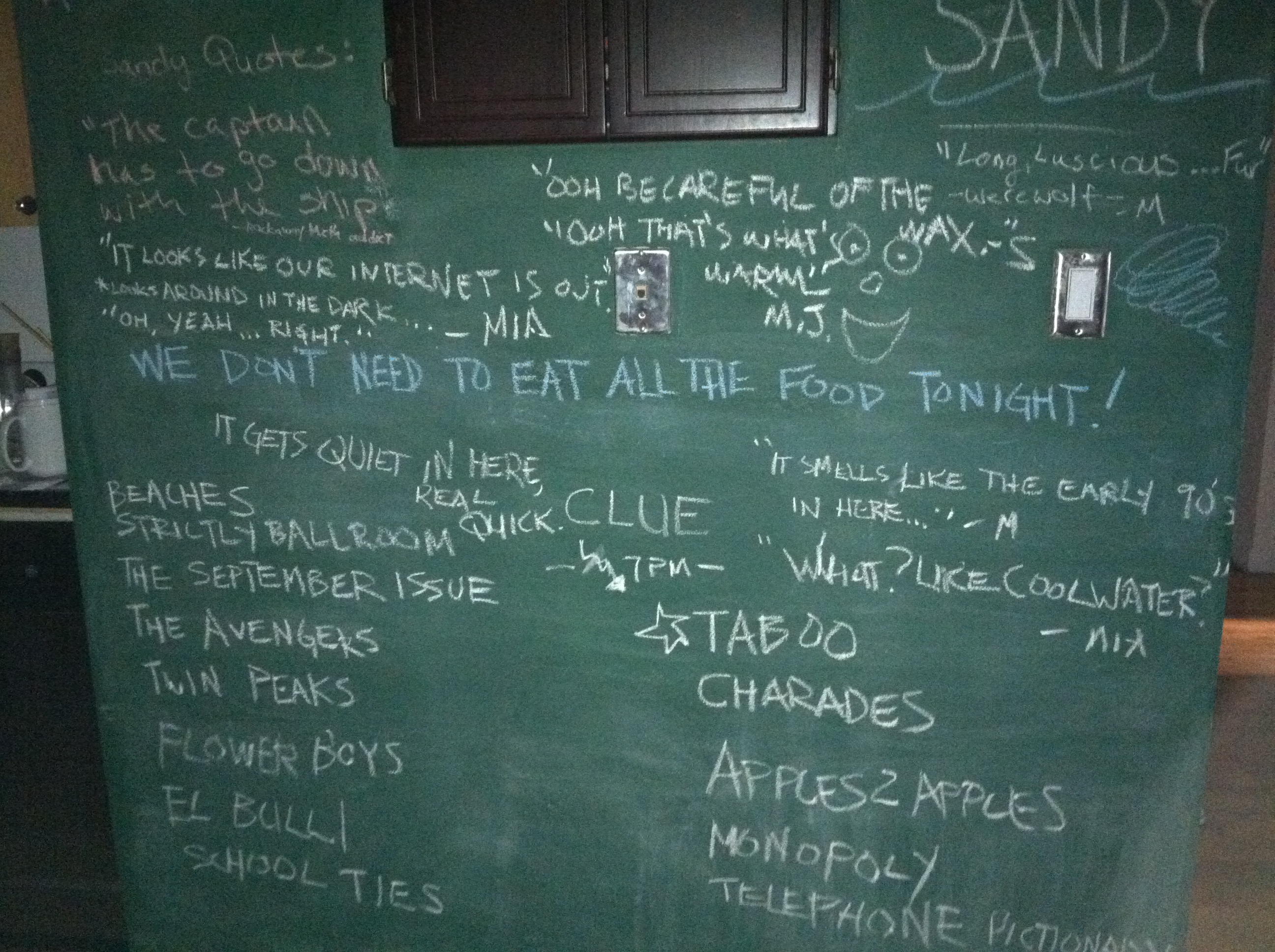 Our roomie Michelle very wisely suggested we paint one wall into a chalkboard a few weeks ago. This came in handy to capture most of our moments from the storm for the first two days.