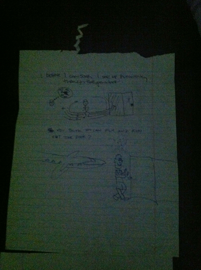 Thankfully, we were all able to hold the worst of it in for two full days. During those days we continued to eat, sleep, get completely mental for a little bit before giving up and taking a walk around the block every few hours and spent a lot of time playing a really fun game called “Telephone Pictionary”, where you each start by writing a common phrase, song lyric, person – basically something that might be fun to draw and not terribly difficult for someone else to guess on a general level. Then you pass the paper on to the next person who draws whatever you wrote; they fold over the original text and hand their drawing to the next person who then writes down their guess for what the drawing is. This text gets passed to the next person who then draws what that last person guessed and so on. When it gets back to the original person the results are read and are generally pretty funny. I learned that I am a much better artist when I can’t see whatever the hell I’m trying to draw. This is good to know and I might add it to my resume.